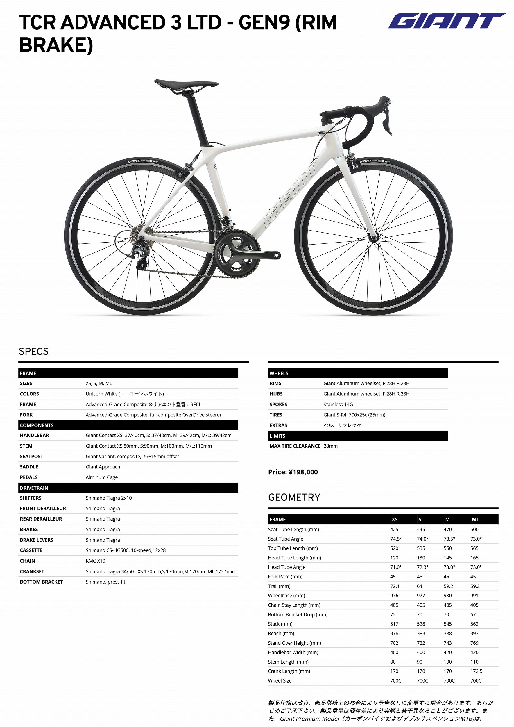 GIANT ( ジャイアント ) ロードバイク TCR ADVANCED 3 LTD Gen9 Rim Brake ( TCR アドヴァンスド 3 TLD 第9世代 リムブレーキ ) ユニコーンホワイト 445S (身長目安170cm前後)