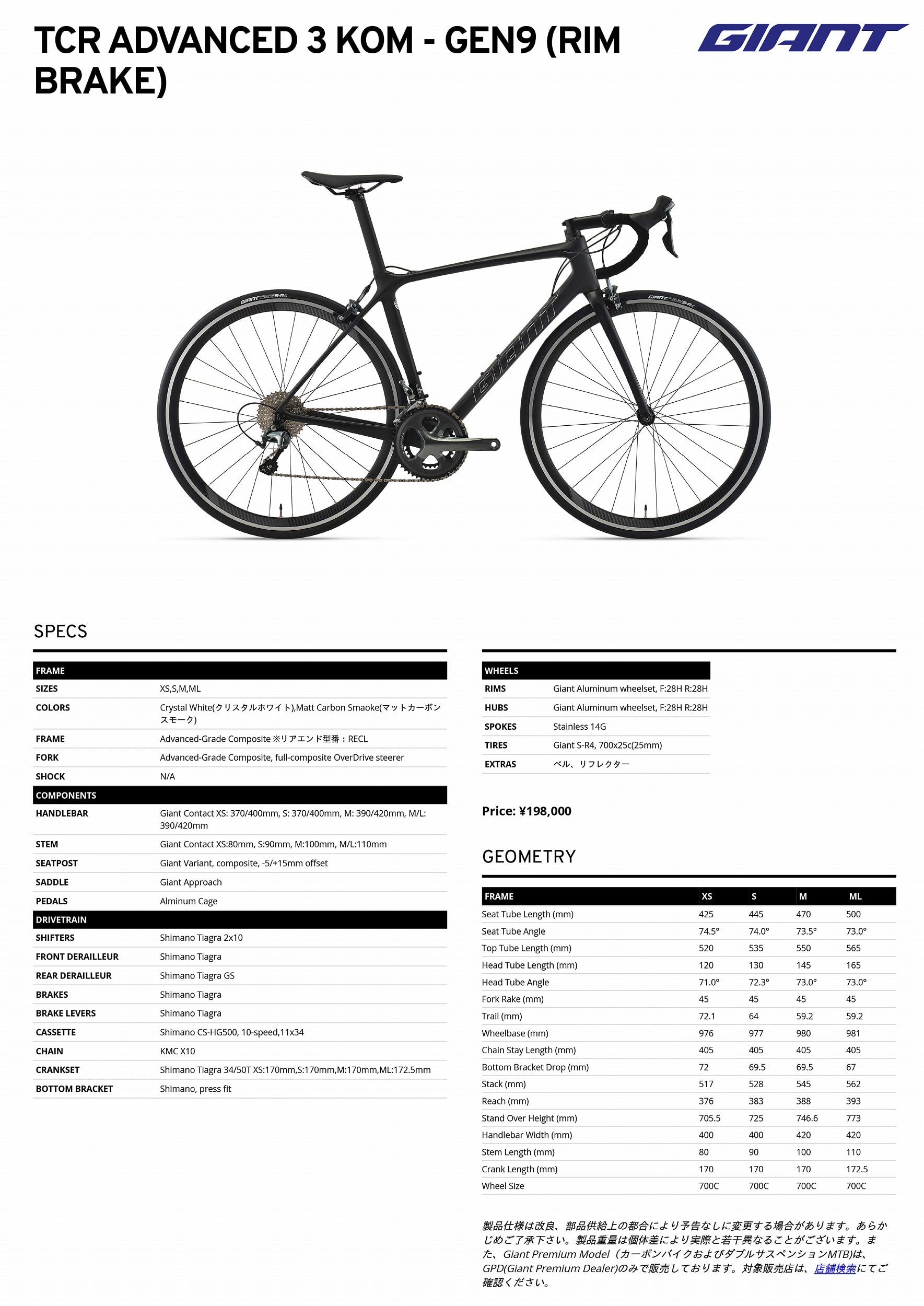 第9世代TCR Advancedのリムブレーキ専用フレームに、シマノ「Tiagra」コンポーネントを組み合わせた日本国内限定モデル。