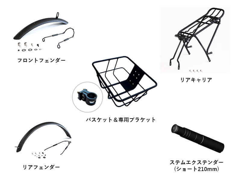 通勤ライドには前後フェンダーや夜間走行も安心のフロントライトなど。