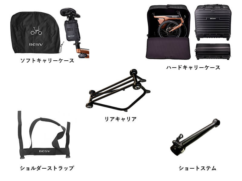 輪行時には必須となるソフトケースや、丈夫なハードキャリーケース、段差での持ち上げ自に有効なショルダーストラップ、ハンドル高を300mm下げるショートステなど、豊富なアクセサリーでユーザーのライフスタイルをサポートいたします。仕様