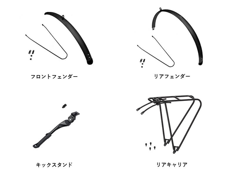 街乗り・通勤・通学から、サイクリング、ツーリングまで、ユーザーの多様な用途に対応すべく、フロントライトを始め、前後フェンダーやキックスタンド、リアキャリアなど、多彩な純正オプションを誤用しています。