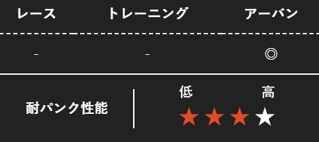 スムーズな路面走行性+ウェット路面での安全性を両立させたグルーブスリックデザインにより、ドライ・ウェット問わず安定したグリップを提供。耐パンク性能に優れたマックスシールドを採用。