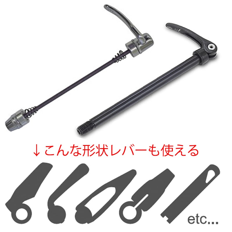 シマノ、カンパニョーロ、フルクラム、マビックなそのクイックレリーズの形状に対応。付属のアダプターでレバー付きスルーアクスルも使用できます。 ※適合しない種類もあるのでご注意ください。