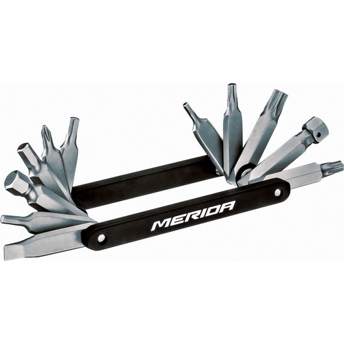 MERIDA MINI TOOL MINIは、わずか80gの軽さながら、ロードやトレイルでの基本的な修理に必要な11種類のツールを内蔵しています。精密で耐久性の高いアルミニウム製のMINI TOOLは、2/2.5/3/4/5/6/8mmの六角レンチ、プラスドライバーとマイナスドライバー、そしてT1/T25/T30のトルクスレンチが付属しています。