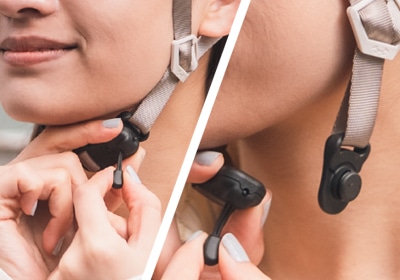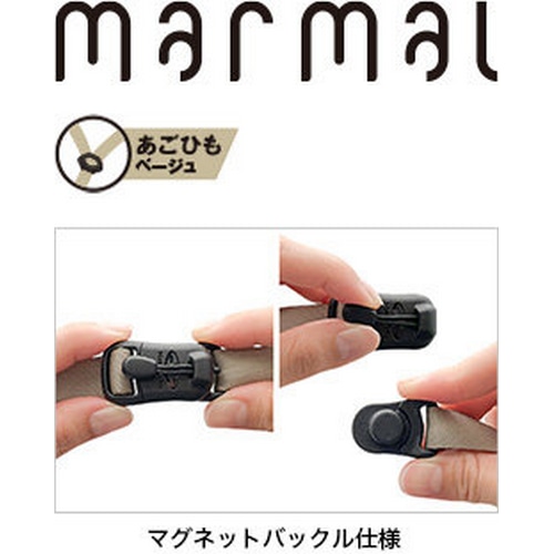 肌なじみが良くファンデーションが目立ちにくいベージュカラーのあごひもを採用。※ペースメーカー・植込み型除細動器・補聴器等の医療機器をご使用のかたへ「マグネットバックル」についてのご注意