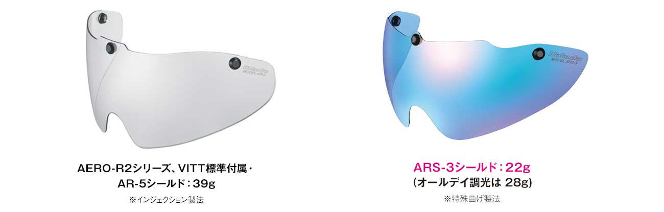 「AERO-R1」用オプションシールド「ARS-3 SHIELD(以下ARS-3)」はもともと、軽量化とカラーシールドを望む選手の要望に応えた、実使用性能優先の選手用スペシャルシールドとして供給していました。しかしARS-3をご覧になられた多くのユーザーの強い要望により商品化を実現しました。