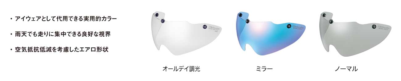 シールドの濃度は最も薄い状態で可視光線透過率88%、最も濃い状態で可視光線透過率28%となっており、シールドの交換なしで、幅広いコンディションを1枚のシールドでカバーできるのが特徴です。