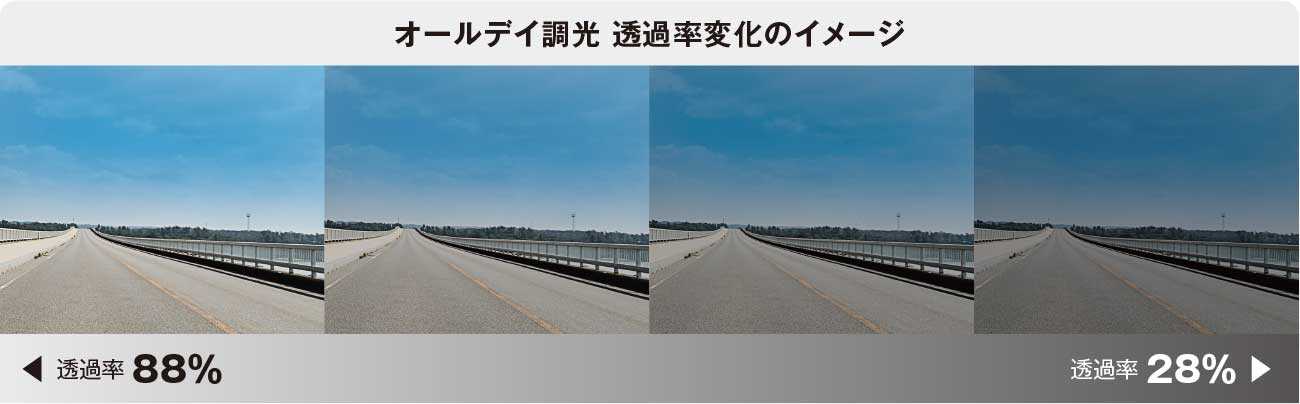 「オールデイ調光」は日差し(紫外線)の強さに応じて可視光線透過率が28〜88%の範囲で変化する調光機能を搭載。