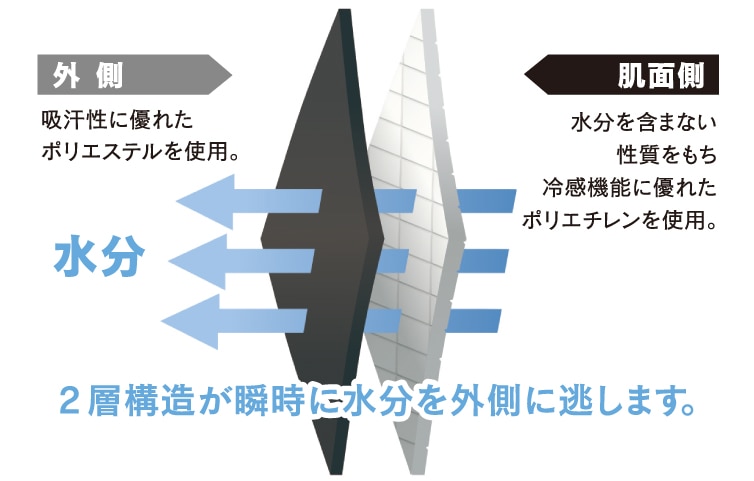 肌面側:水分を含まない性質をもち冷感機能に優れたポリエチレンを使用。