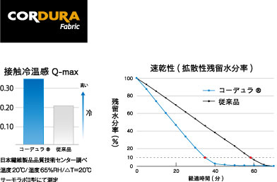 コーデュラは優れた耐久性だけでなく、快適性も提供します。吸汗速乾性能や接触冷感機能でも高い性能を発揮いたします。