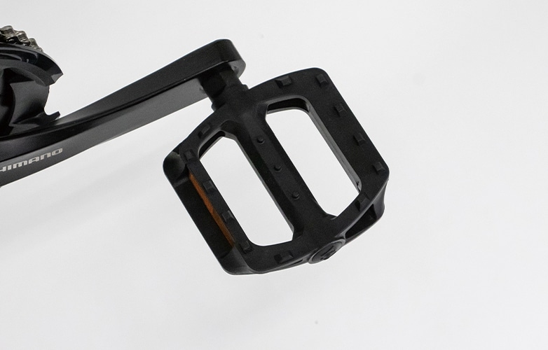 ペダルは滑りづらい樹脂製の幅広ペダルを搭載。