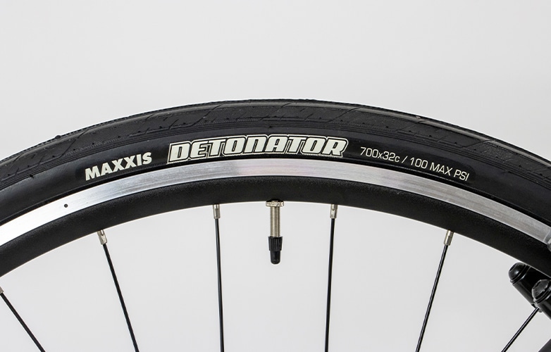 軽量なMAXXIS製のタイヤ「DETONATOR」の少し太めのサイズ700x32cは、少しの段差も快適に超えることができる。これからスポーツバイクを始める方にぴったり。