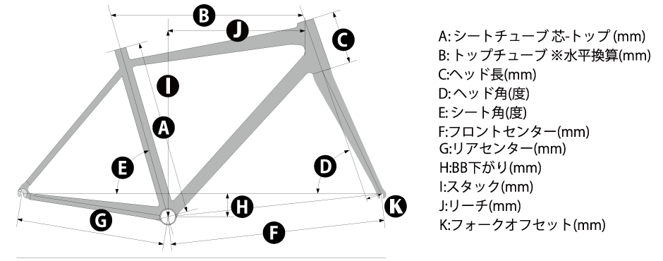 | B:トップチューブ ホリゾンタル 換算芯-芯 (mm) | 500 | 516 | 539 | 554 |