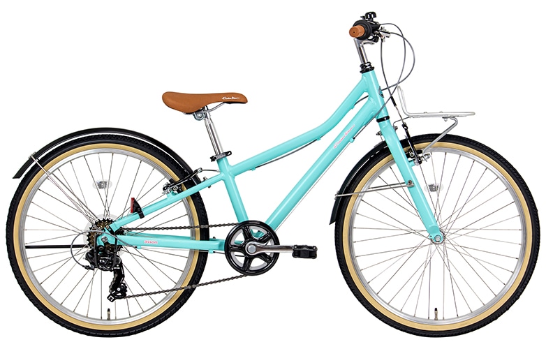 asson J シリーズはスポーツバイクの多くが採用しているVブレーキを使用し、お子様の握力でもしっかり止まることができます。また外装6段変速だから坂道もスイスイ進むことができ、前後の泥除けやギアカバーも付いているから泥はねや裾汚れを防ぐことができます。