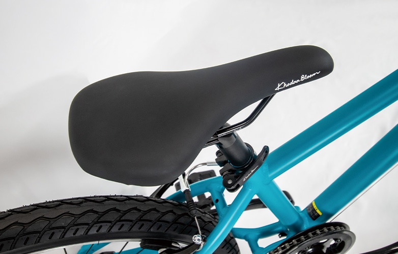 ヘッドを寝かせることで段差の乗り降り等に対して強い設計。直進安定性も向上。大人用と同じ本格アルミフレーム