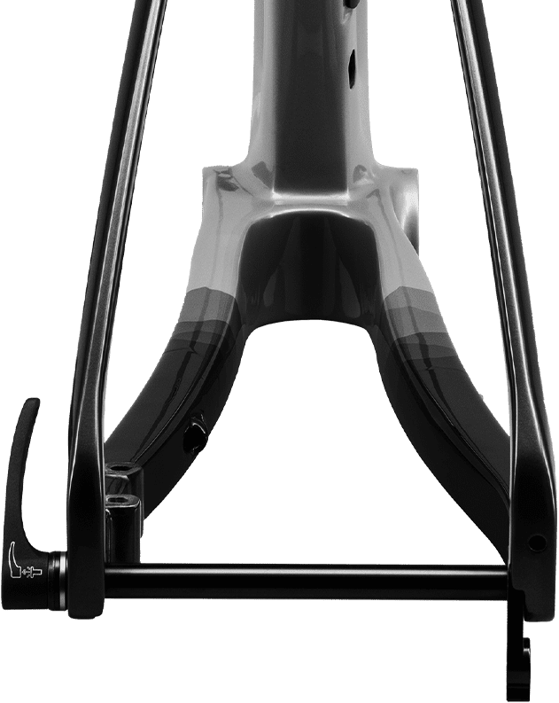 空力とタイヤクリアランスを両立した新設計のフロントフォーク。
