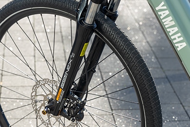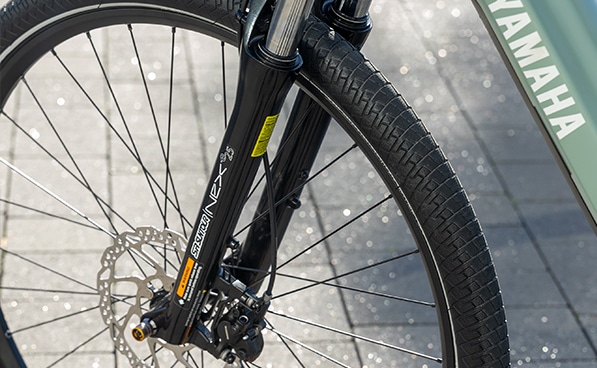 路面の凹凸などの衝撃を吸収し、街中の走行も快適。スルーアクスルタイプ採用。