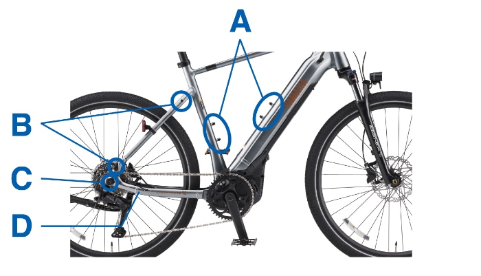 A ボトルケージマウント×2(Sサイズはダウンチューブ側1か所)B キャリヤ用マウント