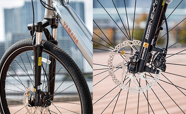 快適なライドをサポートするFサスペンションフォーク&油圧式ディスクブレーキ