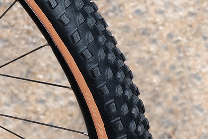 力強いブロックパターンとタンウォールデザイン。グリップ力とタフなルックスを兼ね備え、悪路でも良好なグリップ感を得られる。
