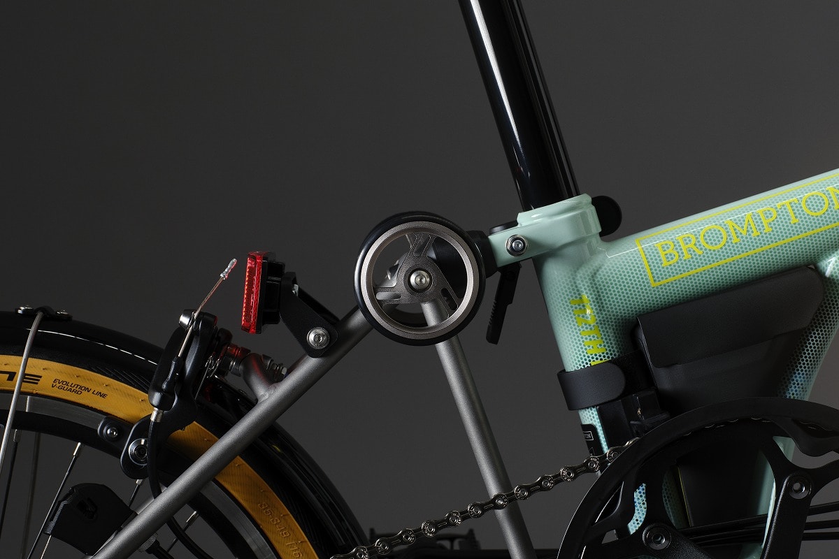 折りたたんだブロンプトンと一緒に歩くための、より大きく、より軽いホイール。新しいトライスポークデザインにより、接地面積が15%拡大しました。工業用高級素材を使用し、耐久性にも優れています。Brompton engineering