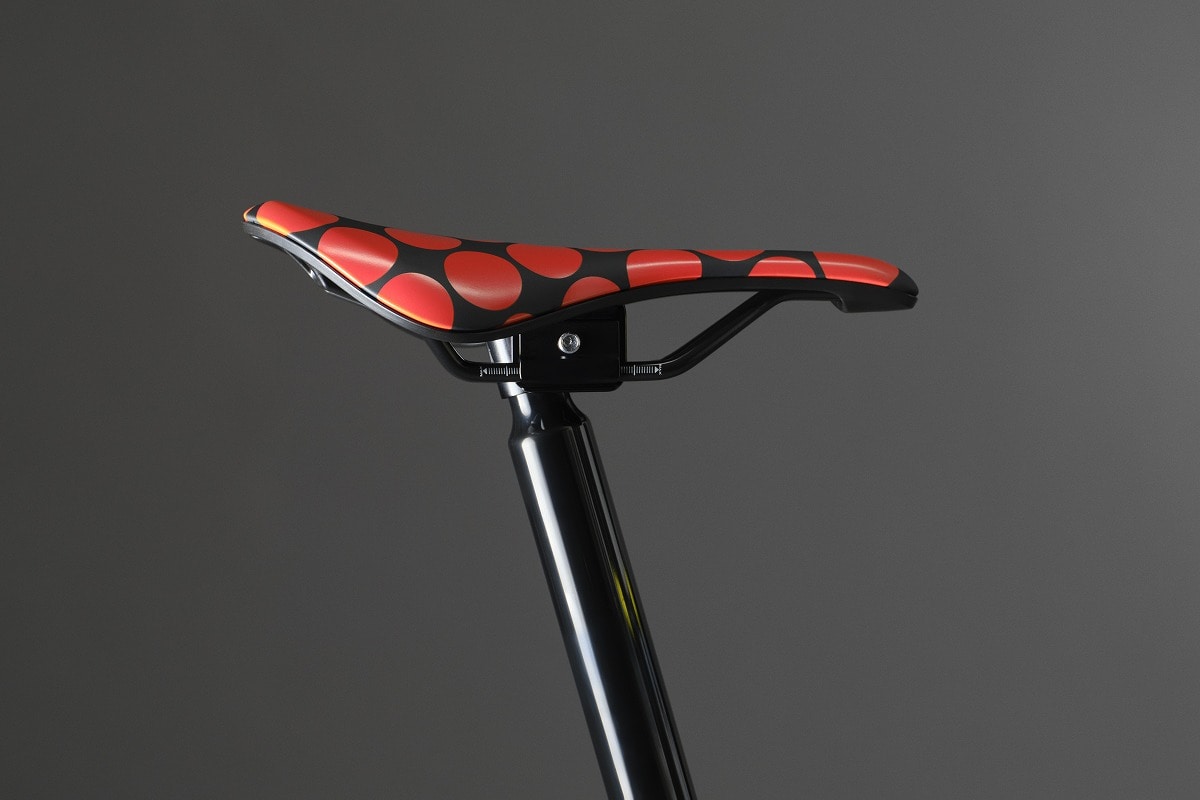 サドルは山岳賞の証ともいえるマイヨ・ブラン・ア・ポワ・ルージュを彷彿させる赤い水玉となっています。