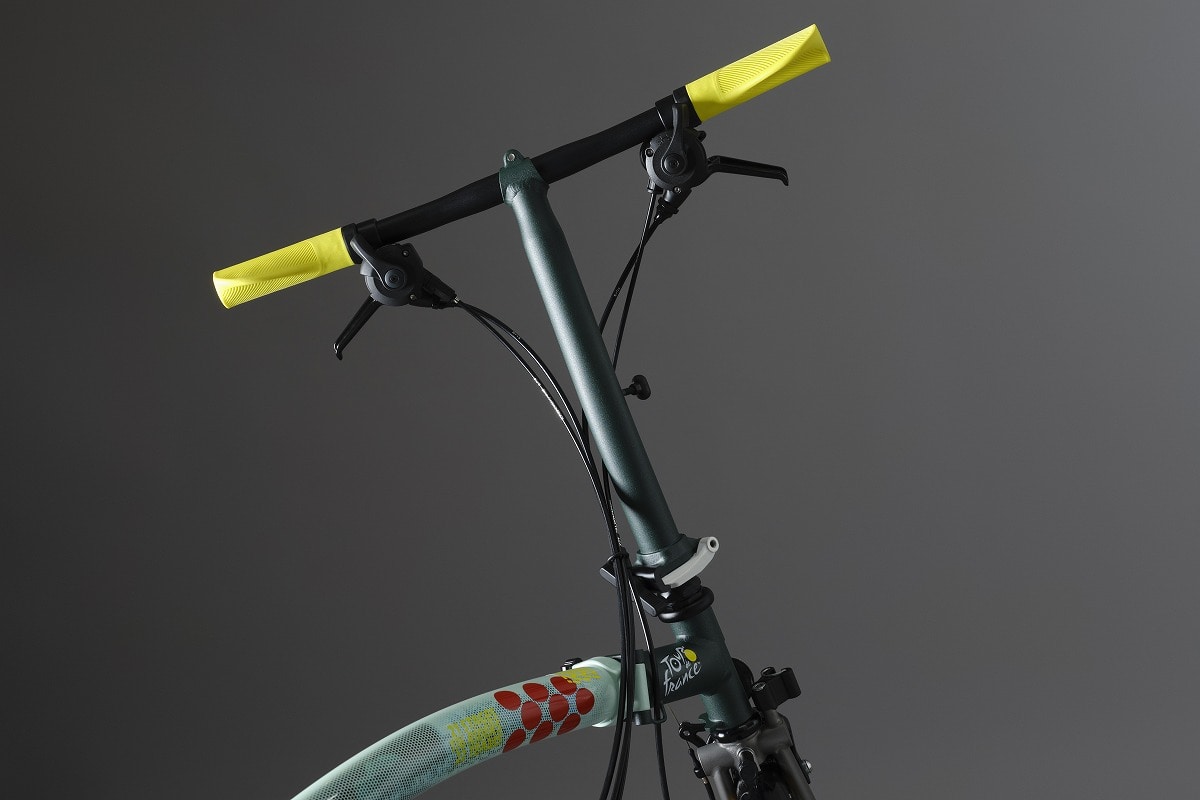 マッドガード フラップには、同じく紛れもないツール・ド・フランスのロゴが付いており、特別にデザインされたデカールは、ツール・ド・フランスへの敬意を表しています。ブロンプトンのロゴも黄色です。