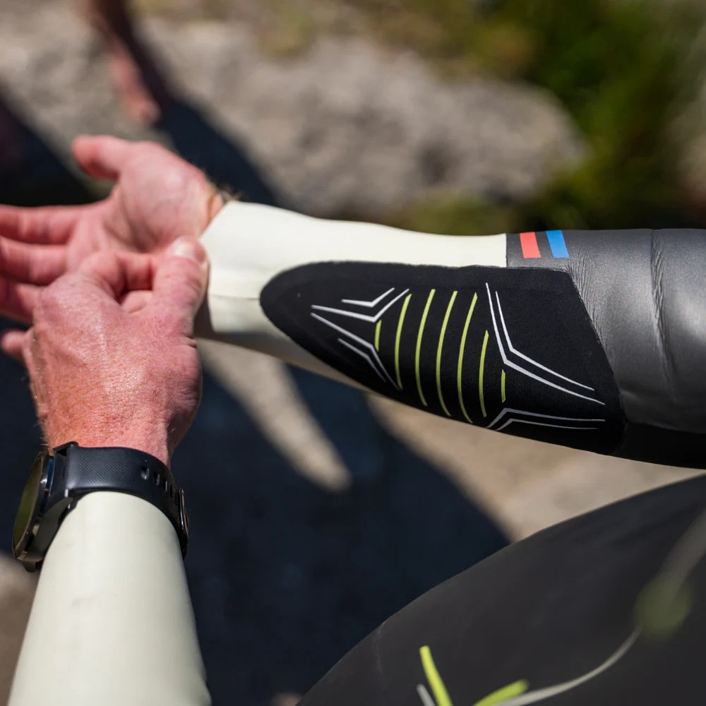 シームレスなウェットスーツの着脱を可能にする2mm厚のスピード・カフスは、ウェットスーツの着脱を容易にする形状。前側が長く、ふくらはぎ側が短めの設計です。トランジション時に重要な時間を節約し、パフォーマンスに集中できる設計です。