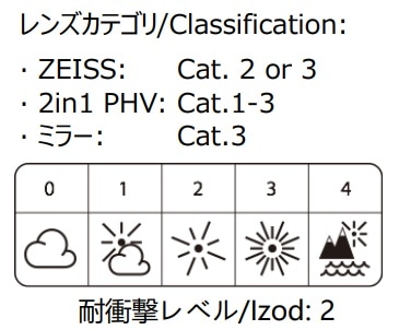 | レンズカテゴリー | ・ZEISS: Cat. 2 or 3 ・2in1 PHV: Cat.1-3 ・ミラー: Cat.3 |