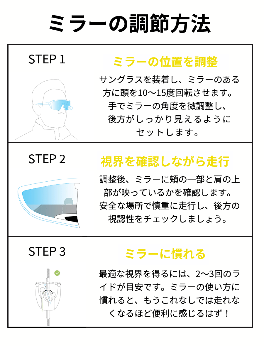 レンズの端に小型リアミラーを一体化した特許取得のサングラス。わずかに視線を逸らすだけで後方が確認でき、振り返る際のふらつきや前方視界の喪失を大幅に削減し、安全性を向上します。