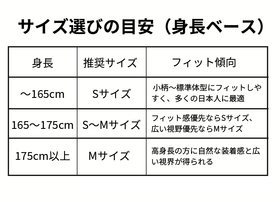 S - レンズ幅:140mm / レンズ高:55mm M - レンズ幅:145mm / レンズ高:58mm |