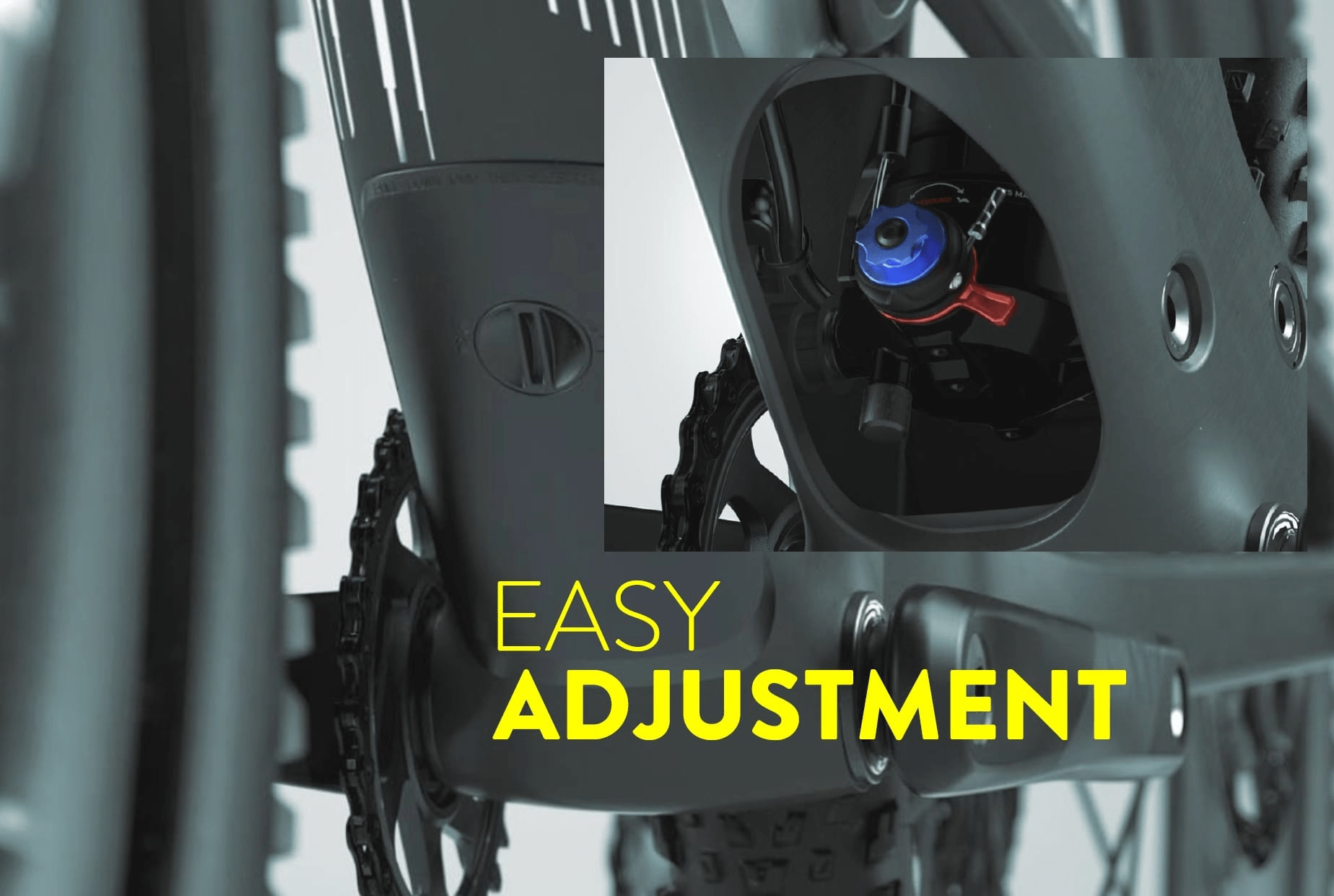 ダウンチューブBB側のハッチを開けると、リアユニットの調整機構が目の前に現れます。