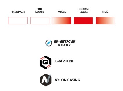 アグレッシブなエンデューロレース向けに設計されたこの高性能コンパウンドは、過酷なトレイルでもスピード、コントロール性、そしてダンピング性能を発揮します。グラフェンは転がり抵抗と耐久性を高め、シリカは木の根、岩、ロームへのグリップ力を高めます。