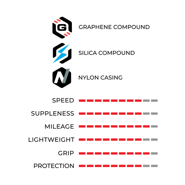 グラフェン + シリカを配合したレースフォーミュレーションは、長寿命のグリップと低い転がり抵抗を実現し、耐久性を向上するために最適化された耐久性の高いコンパウンドミックスです。