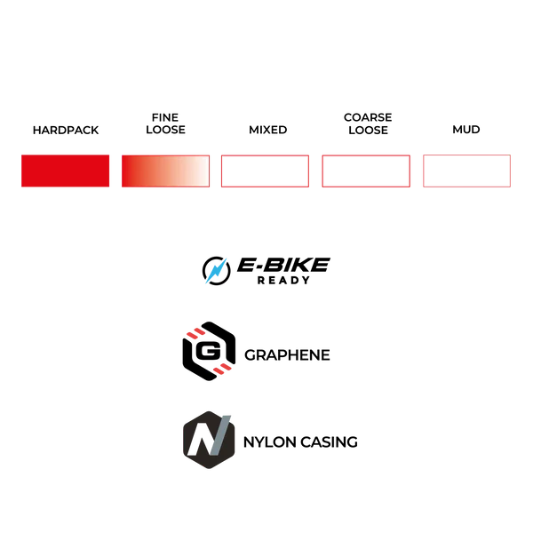 トレイルがハードパックでスピードが全てなら、Terreno XC Trailがまさにその答えです。高速転がり抵抗の少ないフィッシュスケールのようなセンタートレッドは、滑らかでドライな路面を軽やかに駆け抜け、確実なブレーキングとコーナリンググリップは、ペースが上がってもライダーのコントロールをしっかりと保ちます。