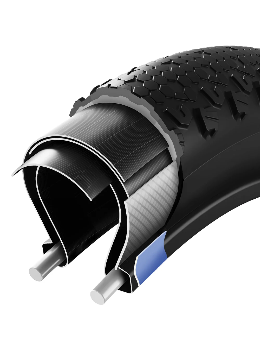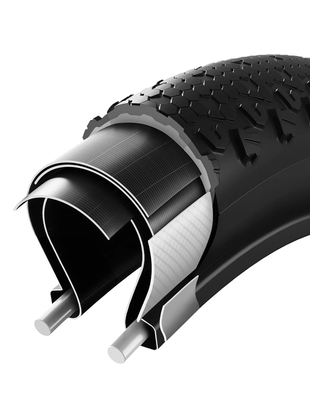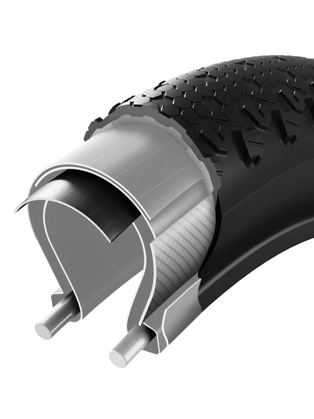 探検のために設計された、耐久性の高い60TPIナイロンケーシング。耐摩耗性と耐パンク性に優れ、中程度の柔軟性でトレイルとの一体感を維持します。