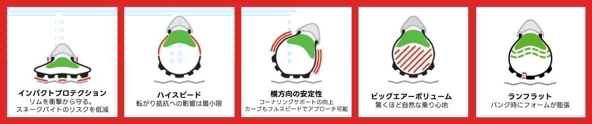 - 最適な低圧で走行してもリム打ちやスネークバイトのリスクを軽減。