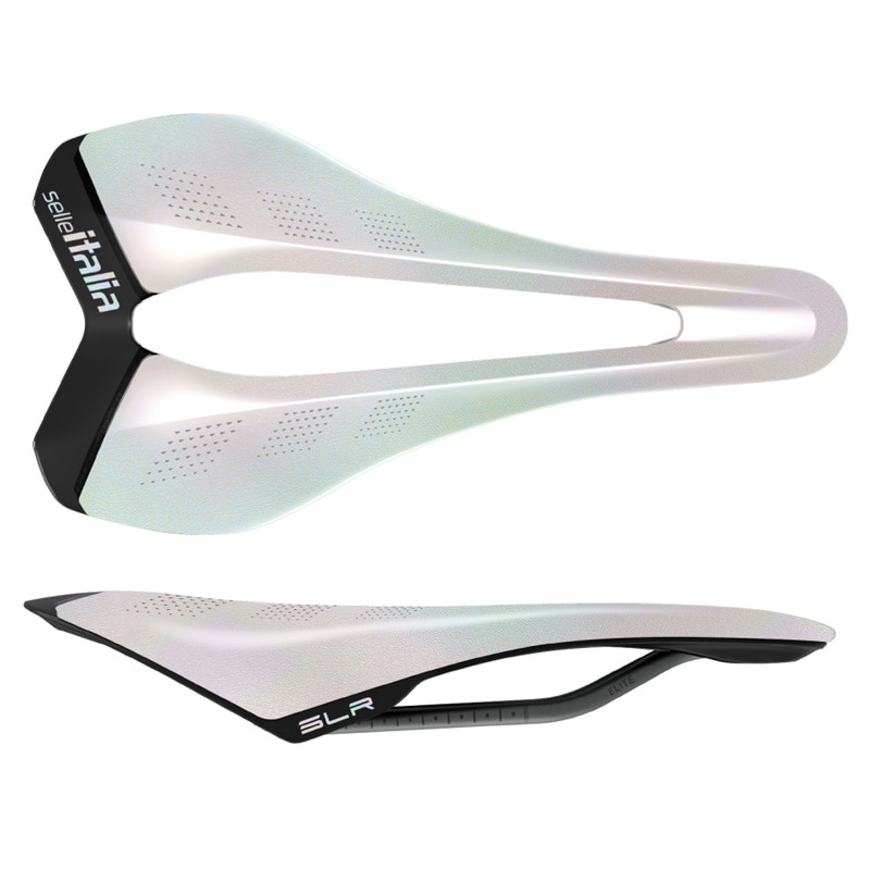 シェルにはオパールホワイトの反射グラフィックが施され、Selle ItaliaのロゴとSLRのモデル名が描かれています。