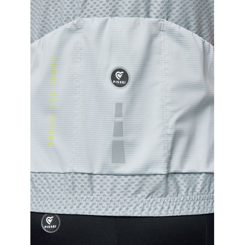 あらゆる体型にフィットする構造で、クローズドでエアロダイナミクスに優れた素材を使用した生成りの袖と、通気性を最大限に高めるメッシュの背面とのコントラストが美しい。背面中央のポケットに採用されたピクセル・テクノロジーは、低照度下でのライドを安全にサポートする。