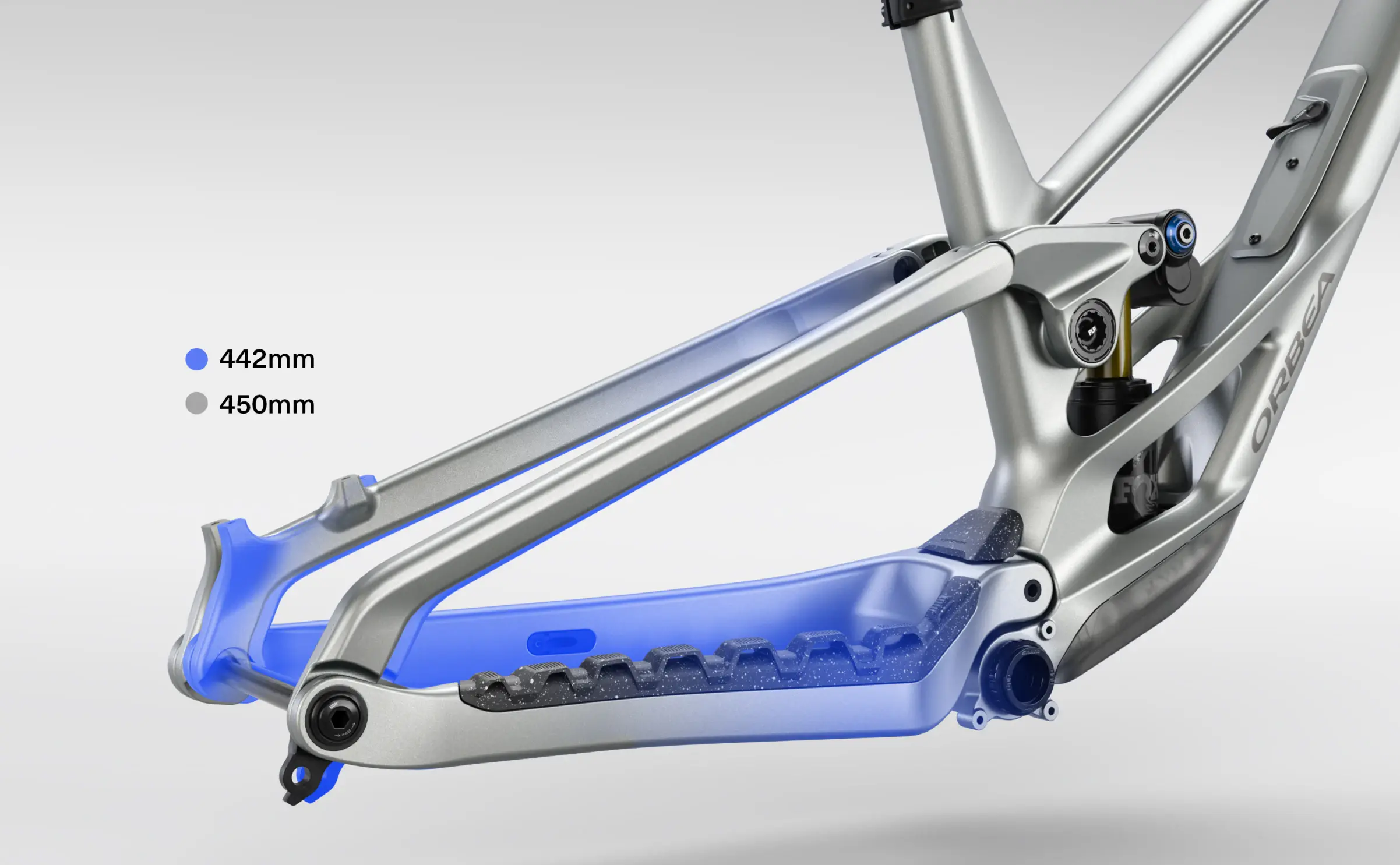 チェーンステーの長さをお選びください。遊び心のあるライディングには442mm、高速走行時の安定性には450mm。