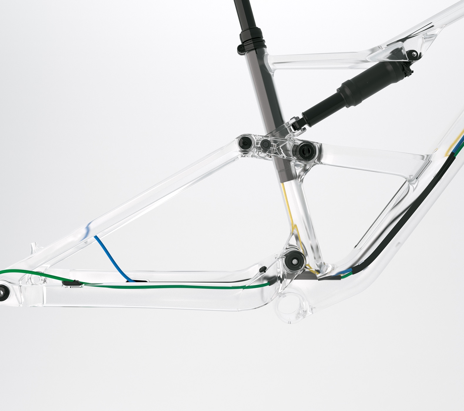 Occamの内蔵ケーブル・ルーティングは、ガタつきがなく、メンテナンスも容易。シリコンの開口部プラグがノイズをさらに低減し、ガイド付き内部コンジットがフロントとリアのトライアングル間のクリーンで静かなケーブルの動きを保証します。
