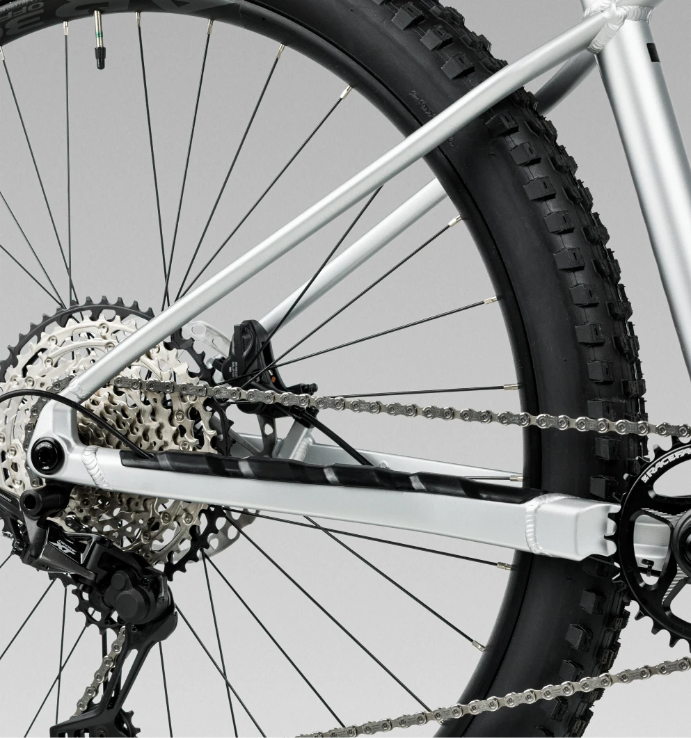 チェーンステーは、保護性能とノイズ低減を目的としたカスタム設計のラバーバンパーで保護されています。