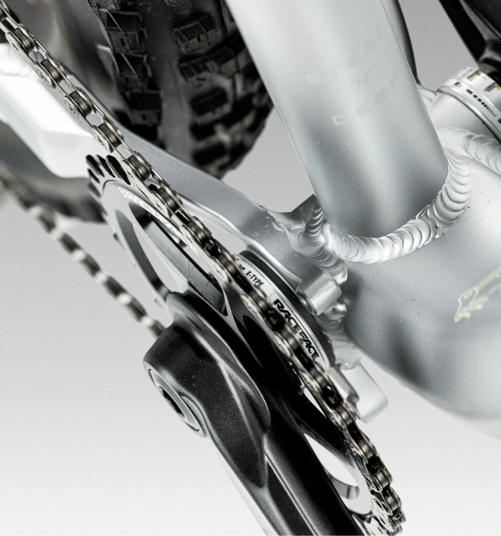 ゆったりとしたローダウンフレーム。操作性を最大限に高めるSteep 'n' Deepと、ワイルドなライディングに対応する140mmフォークを採用。チェーンステーは精密に成形され、グリップ力の高い2.6インチタイヤとのクリアランスを確保。