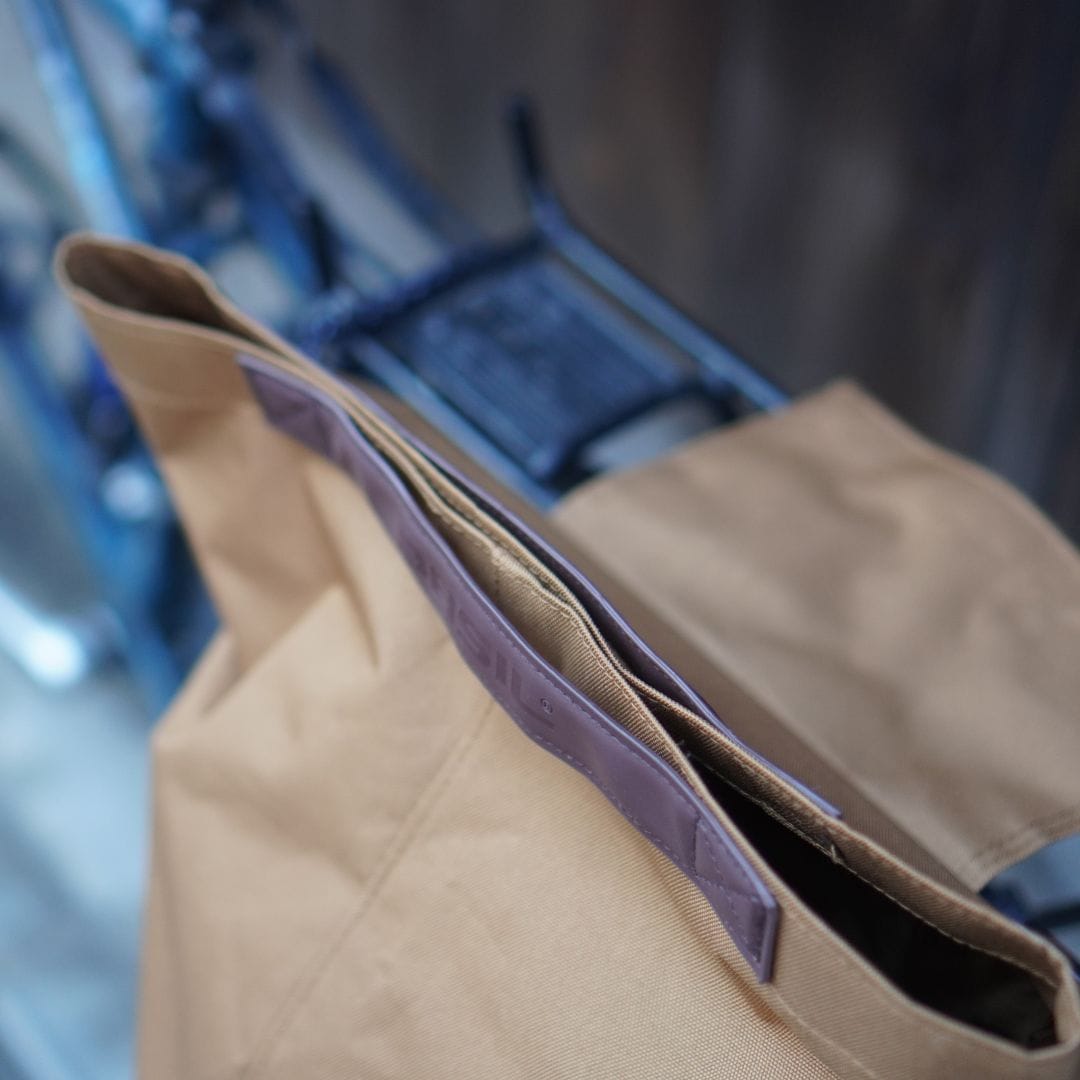 開口部に縫い付けられたフェイクレザーは取っ手になっていて、持ち運びやバッグの脱着時に便利