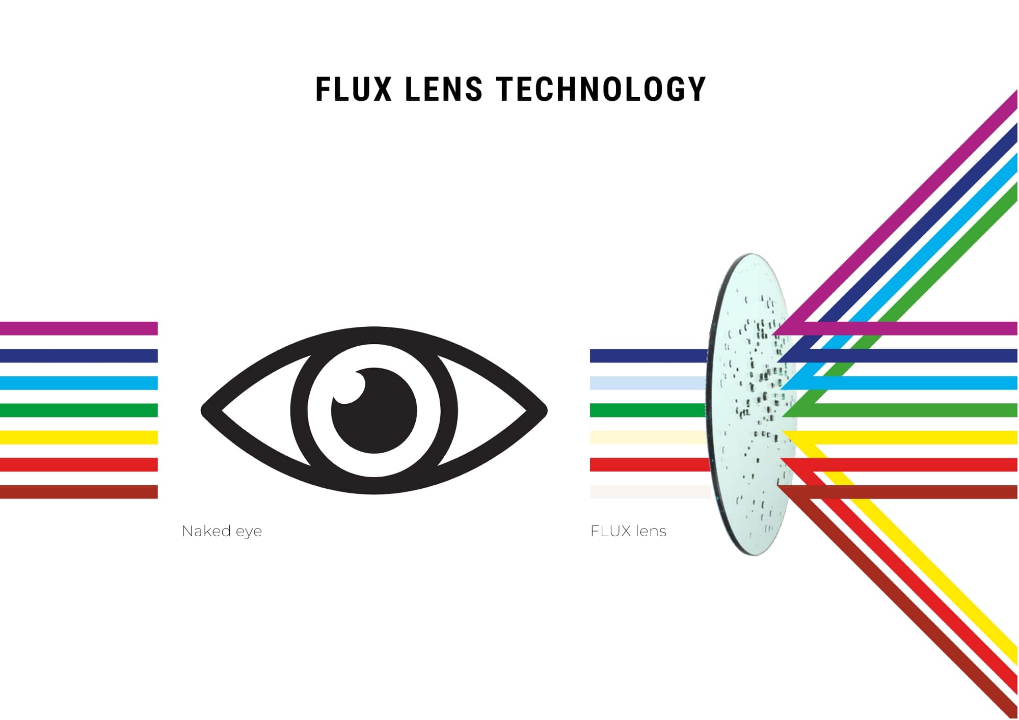 FLUXは、ラテン語の「Fluxus(フロー)」に由来し、「流れ」の意味を持ちます。その名の通り、FLUXレンズは精密さを追求し、最適なコントラストを実現するために必要な波長の光のみを透過させます。