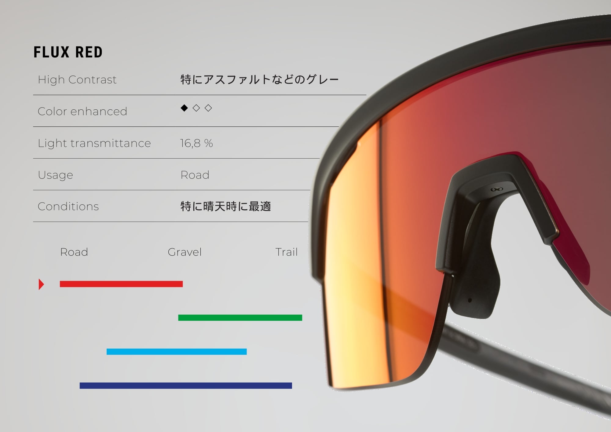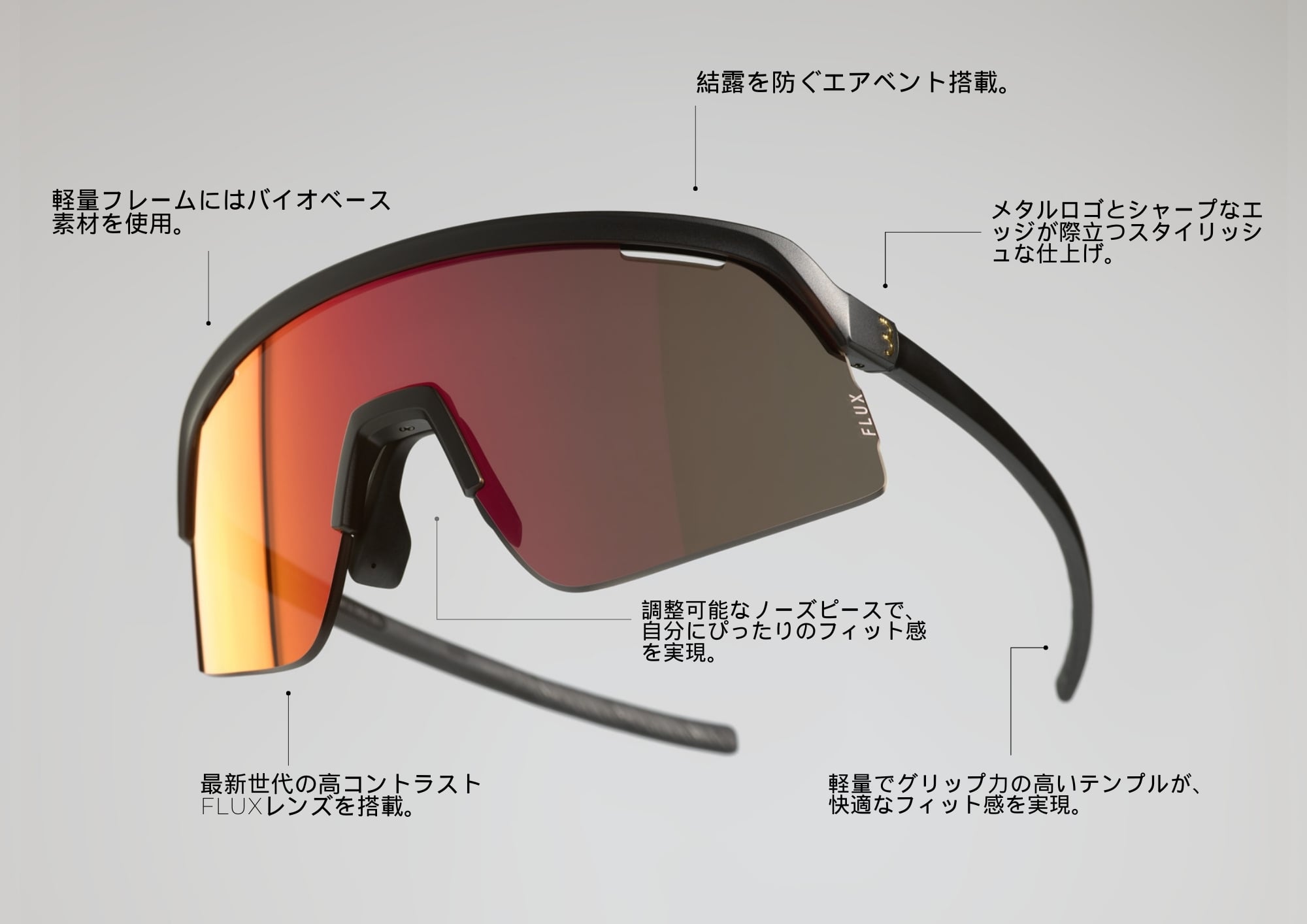- 光の7原色のうち赤・緑・青色光線以外をフィルターすることでサイクリングにおけるさまざまな効能をもたらす「FLUX」レンズ採用
