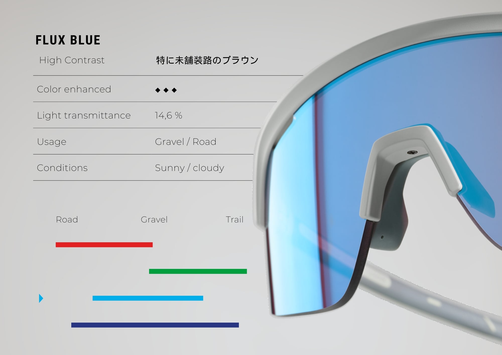 FLUXブルーレンズは、路面や天候を問わず幅広く対応できる汎用性の高いレンズです。主に暖色系の光を透過するため、晴天はもちろん曇りの日でも快適な視界を提供し、開けたフィールドから森林まで、あらゆる環境で活躍します。