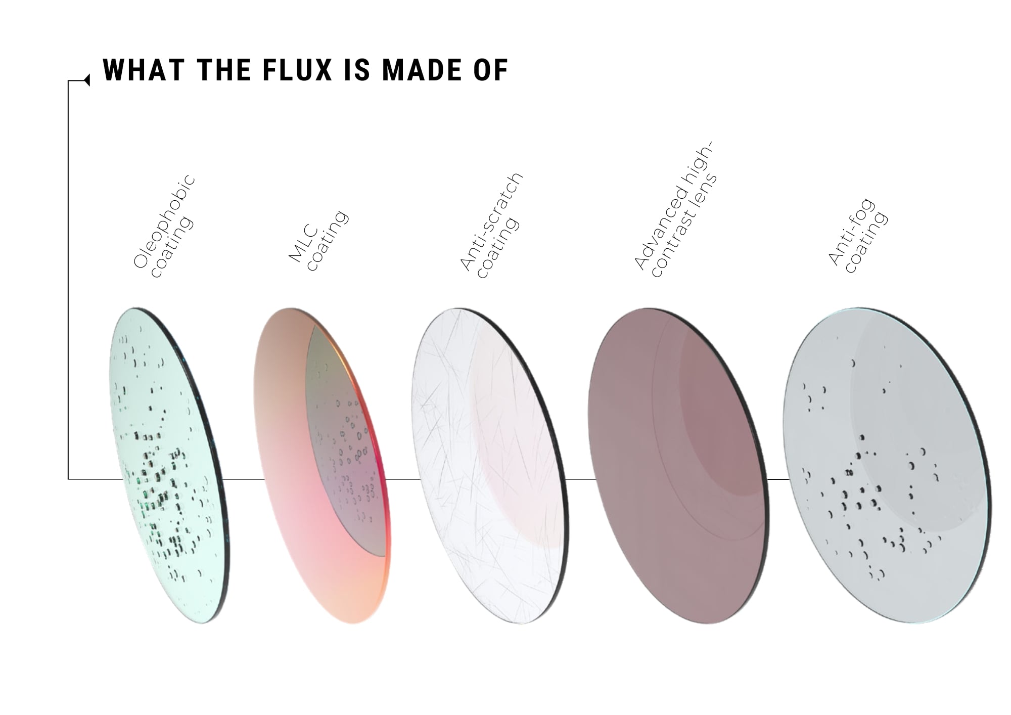 FLUXレンズは、驚異的なコントラストと高性能コーティングで、あなたのパフォーマンスを次のレベルへ引き上げます。また、水や汚れを弾く撥水・防汚コーティングに加え、傷防止加工を施し、常にクリアな視界を確保。