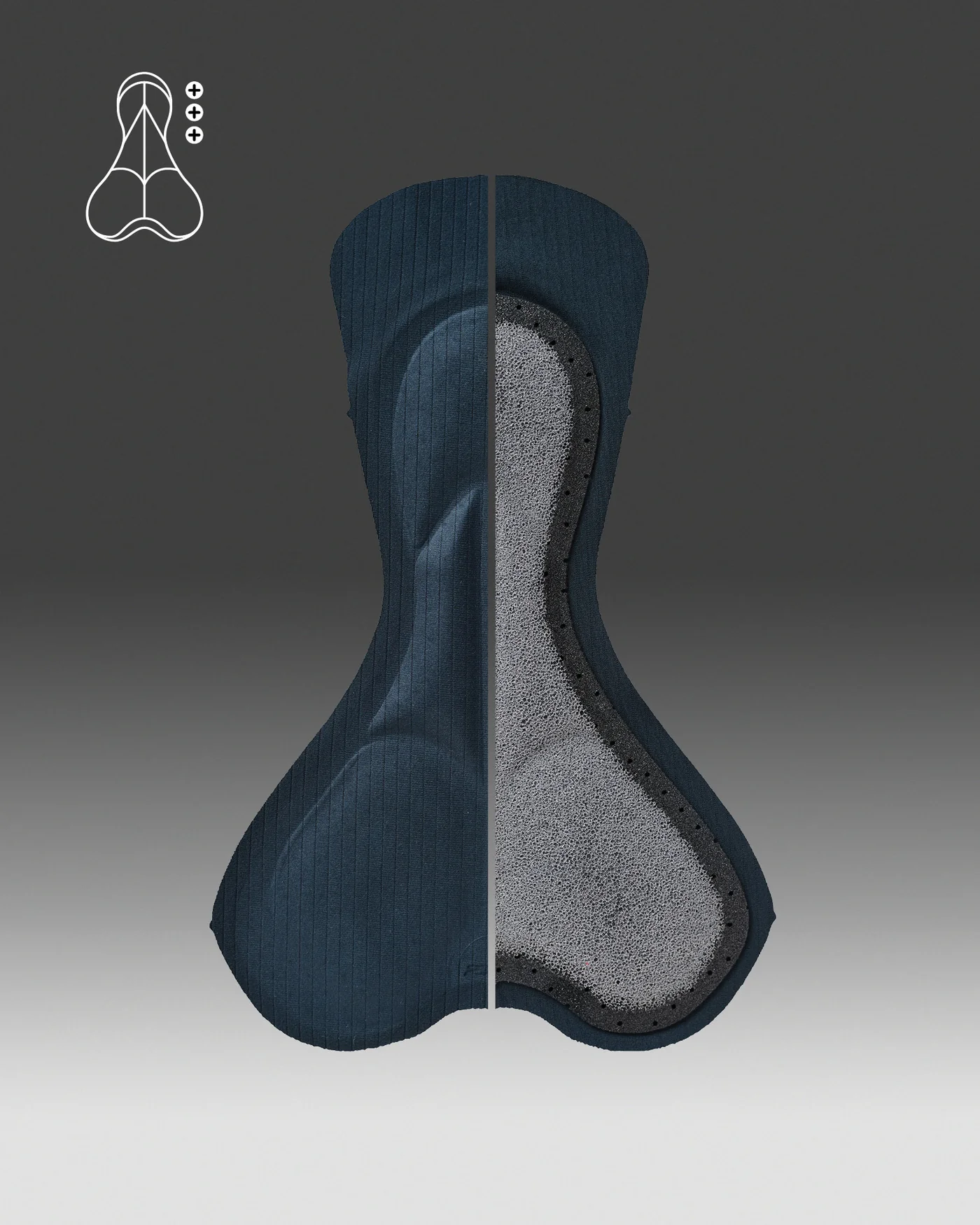 アイアンマンの長距離走向けに設計されたこの二層パッド(通気性に優れた90密度6mmフォームと超軽量140密度3mmフォームを組み合わせ)は、Skyveテクノロジー(フォームを削り、成形する技術)と「フリーエッジ」構造(パッドの外側のエッジ全体にフォームを使わず、ステッチを完全にフラットにすることで、最適なサポートと快適性を実現)を採用しています。仕様