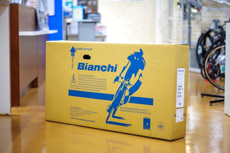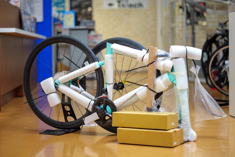 メーカーの工場から届いた自転車を、そのまま右から左に何もせずお渡ししている訳ではありません。メーカーからは、7割ほど組み立てられた状態で段ボール箱に梱包された、通称「七分組」と呼ばれる形でお店に納品されます。